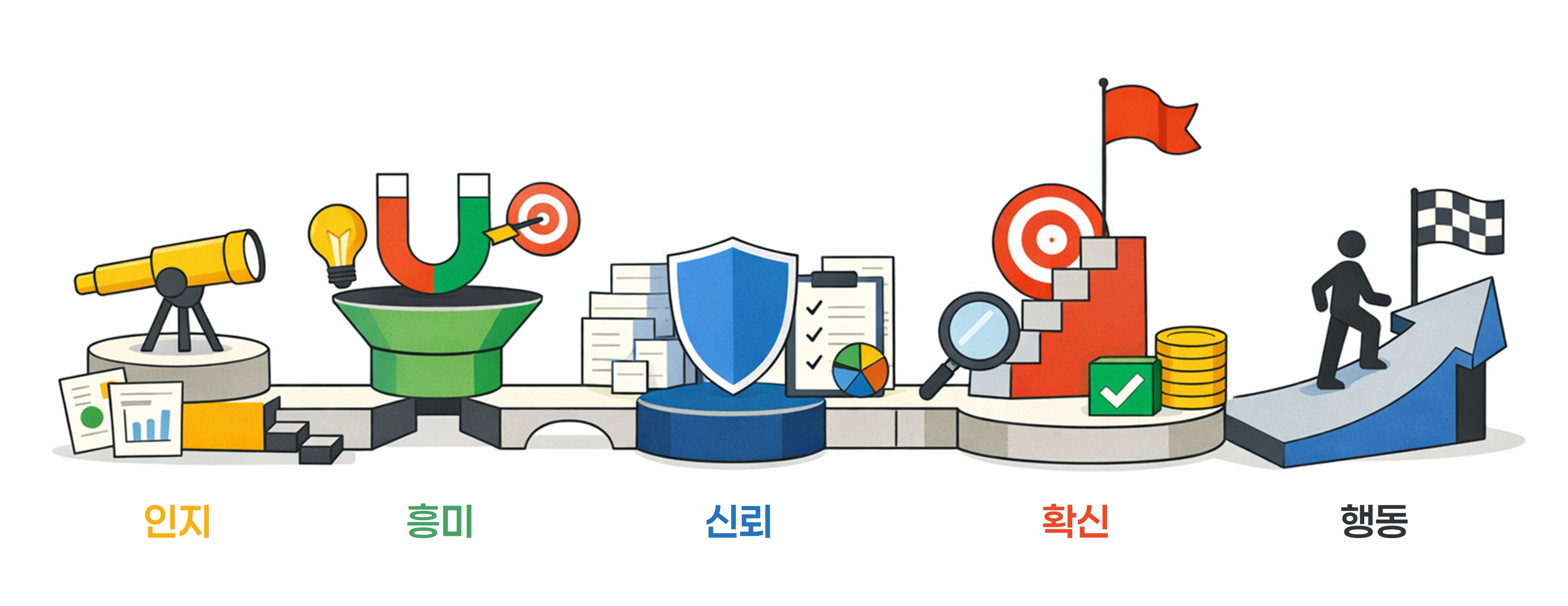 그들은 인지 → 흥미 → 신뢰 → 확신 → 행동이라는 심리 단계를 거치며, 각 단계마다 다른 질문을 던집니다.