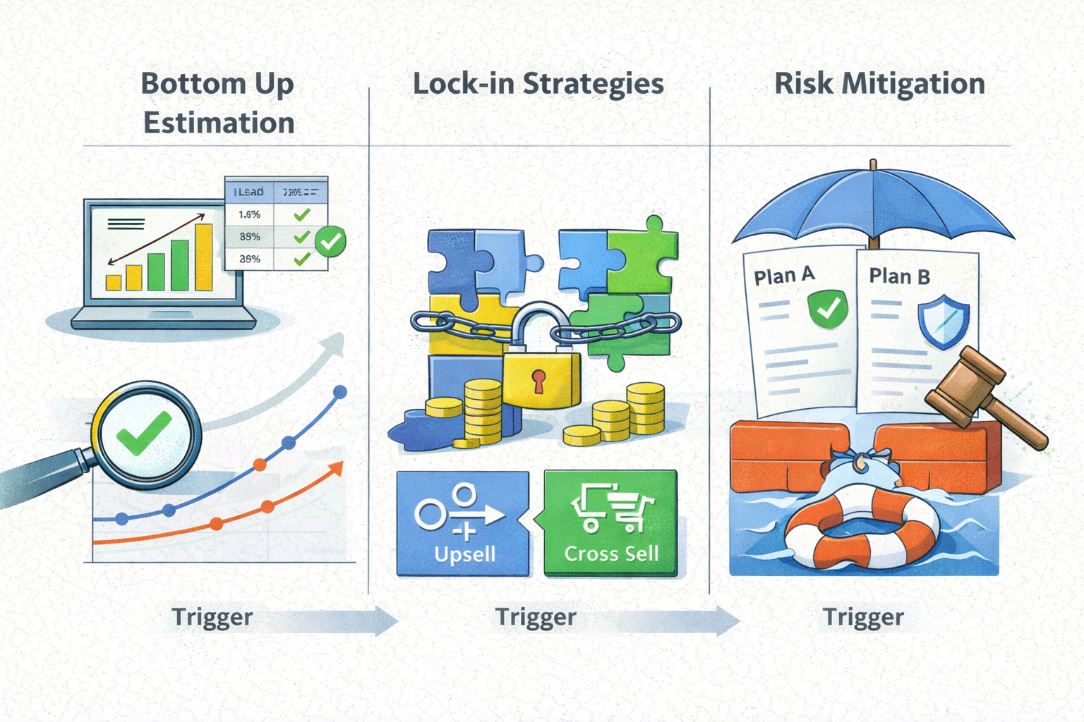 - Bottom-up 방식의 매출 추정: 단순 시장 점유율 예측이 아닌, 실제 영업 파이프라인과 전환율 기반의 추정치를 제시하세요.